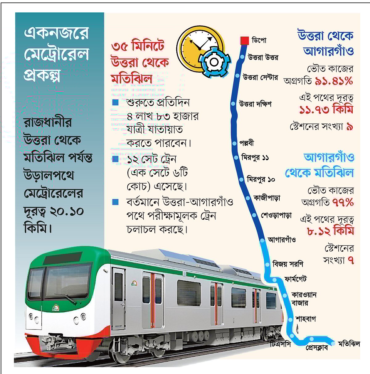 উত্তরা থেকে মতিঝিল পর্যন্ত মেট্রোরেলের দূরত্ব ২০ দশমিক ১০ কিলোমিটার। এই পথে ১৬টি স্টেশন রয়েছে। ট্রেন চালু হলে যাত্রীদের সুবিধার্থে উত্তরা ও আগারগাঁও স্টেশনের সঙ্গে বিআরটিসির বাস চালুর পরিকল্পনা রয়েছে। অর্থাৎ যাত্রীরা সহজে যাতে স্টেশনে যেতে পারেন এবং নেমে বাস পান—এ জন্য বিআরটিসির সঙ্গে প্রাথমিক সমঝোতা হয়েছে মেট্রোরেল কর্তৃপক্ষের।