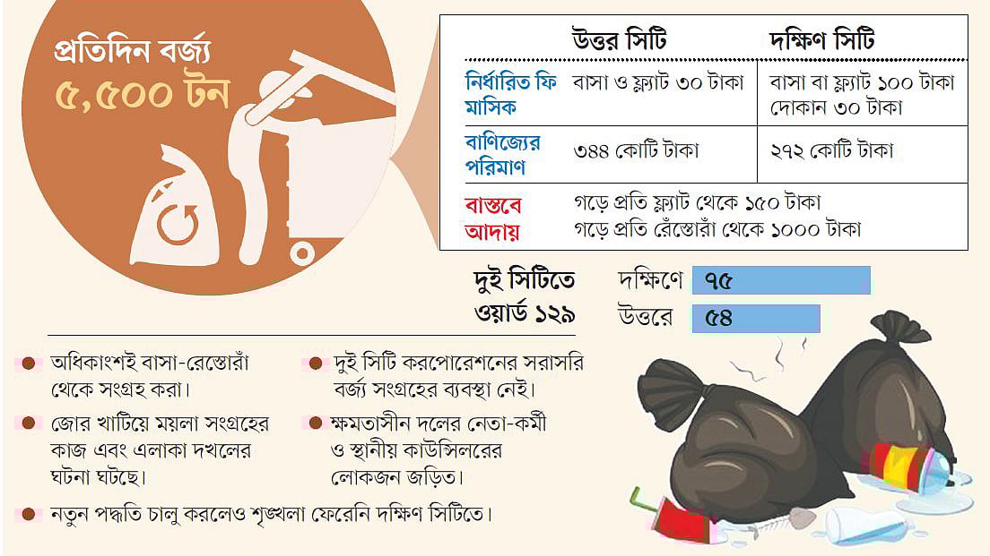 ঢাকার দুই সিটি করপোরেশন প্রতিবছর যে গৃহকর আদায় করে, তার চার ভাগের ১ ভাগ নেয় পরিচ্ছন্নতা বাবদ। গত অর্থবছরে নগরবাসীর কাছ থেকে পরিচ্ছন্নতা কর আদায় করা হয়েছে ১১৬ কোটি টাকার বেশি। কিন্তু সিটি করপোরেশন বাসাবাড়ি থেকে ময়লা সংগ্রহ করে না। তারা ময়লা নেয় সেকেন্ডারি ট্রান্সফার সেন্টার–এসটিএস (বাসাবাড়ি থেকে সংগ্রহ করা বর্জ্য যেখানে জমা করা হয়) থেকে। আর বাসাবাড়ি থেকে এসটিএস পর্যন্ত ময়লা নেয় বেসরকারি বিভিন্ন সংস্থা, যা এখন মূলত কাউন্সিলরদের দখলে চলে যাচ্ছে।