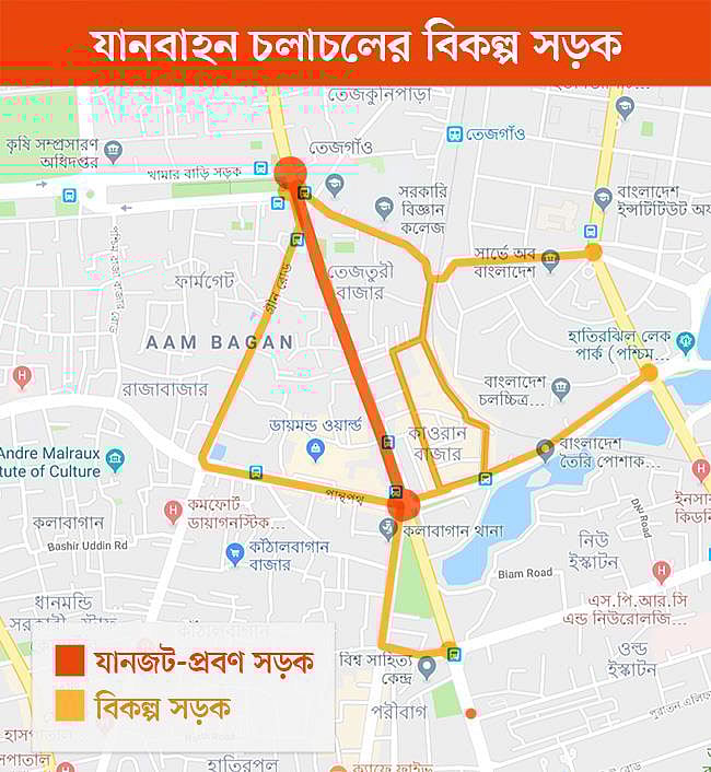 ফার্মগেট থেকে কারওয়ান বাজার সার্ক ফোয়ারা পর্যন্ত কাজী নজরুল ইসলাম অ্যাভিনিউ এবং বাংলামোটর থেকে ফার্মগেট পর্যন্ত সড়কের বিকল্প সড়ক করেছে ট্রাফিক বিভাগ। এ জন্য ট্রাফিক বিভাগকে সহায়তা করেছে মেট্রোরেল কর্তৃপক্ষ। বিকল্প সড়কগুলোর মধ্যে একটি হলো ফার্মগেটের হলিক্রস স্কুল অ্যান্ড কলেজের সামনের সড়ক থেকে তেজগাঁও ট্রাক টার্মিনাল রেলগেট পার হয়ে মেয়র আনিসুল হক সড়ক হয়ে তেজগাঁও সাতরাস্তা মোড়। আরেকটি হলো বাংলামোটরের পশ্চিম পাশ দিয়ে সি আর দত্ত সড়ক থেকে সার্ক ফোয়ারা এবং বসুন্ধরা শপিং সেন্টার থেকে গ্রিন রোড হয়ে ফার্মগেট আনন্দ সিনেমা হলের সামনের সড়ক। এ ছাড়া তেজগাঁও ট্রাক টার্মিনাল রেলগেট থেকে কারওয়ান বাজার হয়ে পেট্রোবাংলা মোড় এবং তেজগাঁও ট্রাক টার্মিনাল রেলগেট থেকে টিসিবি ভবনের সামনের সড়ক দুটিও বিকল্প সড়ক করার পরিকল্পনা রয়েছে। এ জন্য হলিক্রস কলেজ থেকে রেলগেট পর্যন্ত সড়কের পাশে থাকা অবৈধ দোকানপাট উচ্ছেদ করা হয়েছে। এখানে লেগুনা স্ট্যান্ড সরিয়ে ট্রাক স্ট্যান্ডের পাশে নিয়ে যাওয়া হয়েছে।