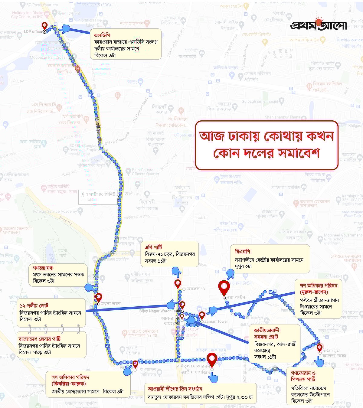 গণফোরাম ও পিপলস পার্টি বেলা তিনটায় মতিঝিলে নটর ডেম কলেজের উল্টো পাশে এবং এবি পার্টি বেলা ১১টায় বিজয়নগরের বিজয়-৭১ চত্বরে প্রতিবাদী অবস্থান ও বিক্ষোভ করবে। গণ অধিকার পরিষদের (নুরুল-রাশেদ) বিক্ষোভ সমাবেশ পল্টনে প্রিতম-জামান টাওয়ারে দলের কেন্দ্রীয় কার্যালয়ের সামনে। গণ অধিকার পরিষদ (কিবরিয়া-ফারুক) সমাবেশ করবে জাতীয় প্রেসক্লাবের সামনে বিকেল চারটায়। বাংলাদেশ লেবার পার্টির সমাবেশ বিজয়নগর পানির ট্যাংকের সামনে বেলা সাড়ে তিনটায়।