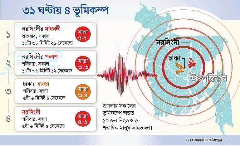 ভূমিকম্পে রাজধানী শহর ঢাকার বড় বিপদের ঝুঁকি আরও স্পষ্ট হচ্ছে। ভূমিকম্পের উৎপত্তিস্থলের নৈকট্য, অপরিকল্পিত নগরায়ণ ও প্রাণহানির ঝুঁকিকে বিবেচনায় নিয়ে এমন মত দিয়েছেন ভূমিকম্প বিশেষজ্ঞরা। গত শুক্র ও গতকাল শনিবার প্রায় ৩১ ঘণ্টার মধ্যে ঢাকা ও এর আশপাশে চারটি ভূমিকম্পের ঘটনা এমন ঝুঁকির বিষয়টি সামনে এনেছে। এর মধ্যে শুক্রবার সকালে ঢাকা থেকে প্রায় ২৫ কিলোমিটার দূরে রিখটার স্কেলে ৫ দশমিক ৭ মাত্রার ভূমিকম্পটির উৎস ছিল নরসিংদীর মাধবদী।