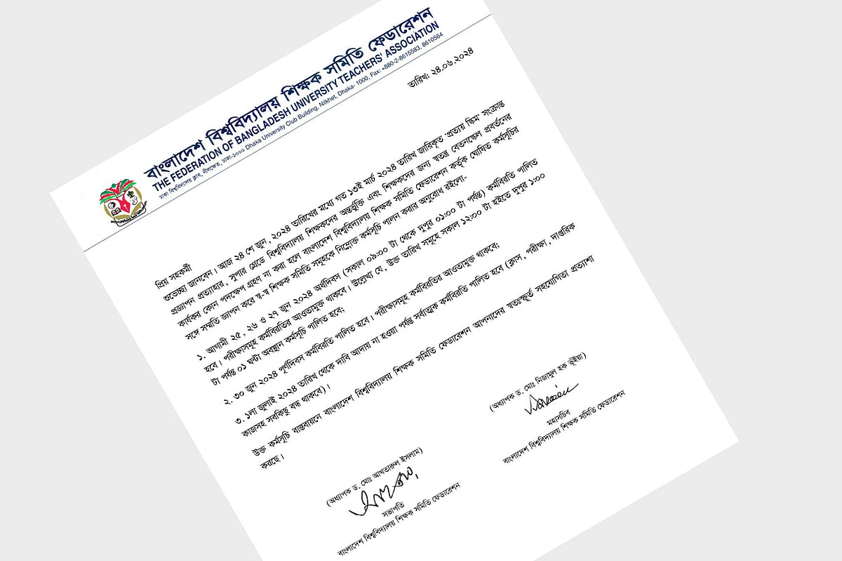 বিজ্ঞপ্তিতে বলা হয়েছে, মঙ্গলবার থেকে বৃহস্পতিবার পর্যন্ত অর্ধদিবস কর্মবিরতি এবং রোববার পূর্ণদিবস কর্মবিরতি পালন করবেন শিক্ষকেরা। এর মধ্যে দাবি পূরণ না হলে আগামী সোমবার থেকে সর্বাত্মক কর্মবিরতি পালিত হবে। এই সময় সব ক্লাস, পরীক্ষা ও দাপ্তরিক কাজসহ সবকিছু বন্ধ রাখবেন শিক্ষকেরা।