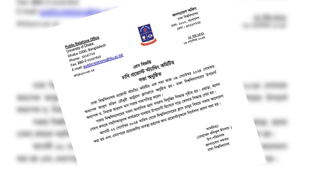 প্রভোস্ট স্ট্যান্ডিং কমিটির সভায় ২২ সেপ্টেম্বর বিশ্ববিদ্যালয়ের ক্লাস চালুসহ কয়েকটি বিষয়ে আলোচনা হয়। ক্লাস চালুর বিষয়ে প্রয়োজনীয় ব্যবস্থা নিতে প্রভোস্টদের নির্দেশ দেওয়া হয়েছে।
