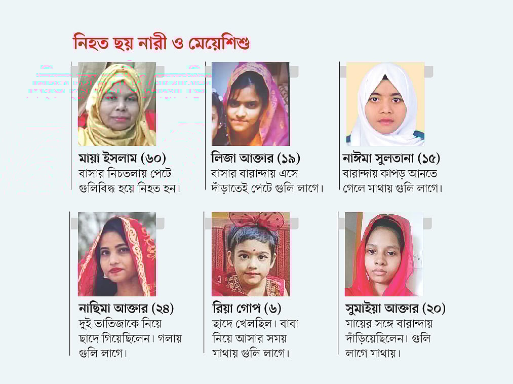 নিহত ছয়জন নারী, কিশোরী ও মেয়েশিশুর মধ্যে তিনজনের মাথায়, দুজনের পেটে ও একজনের গলায় গুলি লেগেছিল। সুমাইয়া, নাঈমা ও লিজা বাসার বারান্দায় গুলিবিদ্ধ হন। রিয়া ও নাছিমা গুলিবিদ্ধ হন ছাদে থাকা অবস্থায়। মায়া ইসলাম গুলিবিদ্ধ হন বাসার নিচতলায় ‘কলাপসিবল গেটে’র ভেতরে থাকা অবস্থায়।