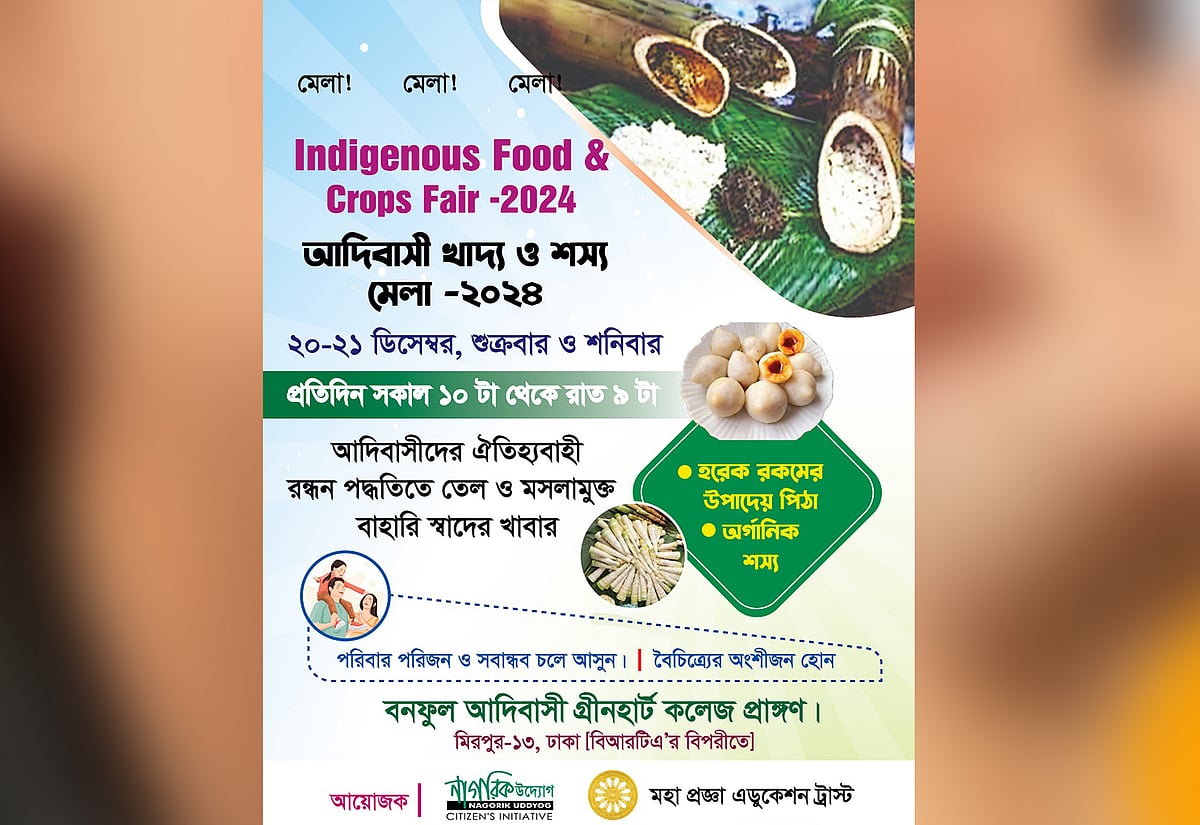 রাজধানীতে আগামী ২০ ও ২১ ডিসেম্বর (শুক্র ও শনিবার) অনুষ্ঠিত হতে যাচ্ছে ‘আদিবাসী খাদ্য ও শস্যমেলা’। মিরপুর–১৩ নম্বরের বনফুল আদিবাসী গ্রিনহার্ট কলেজ প্রাঙ্গণে এ মেলা আয়োজন করা হবে। সকাল ১০টায় শুরু হয়ে মেলা চলবে রাত ৯টায় পর্যন্ত।
