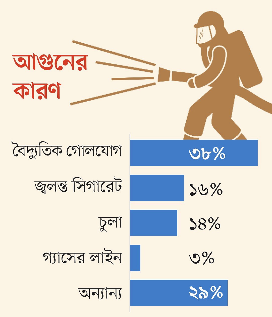 বৈদ্যুতিক গোলযোগ, বিড়ি ও সিগারেটের জ্বলন্ত টুকরা, চুলা ও গ্যাসের লাইন থেকে বেশির ভাগ অগ্নিদুর্ঘটনা ঘটছে।