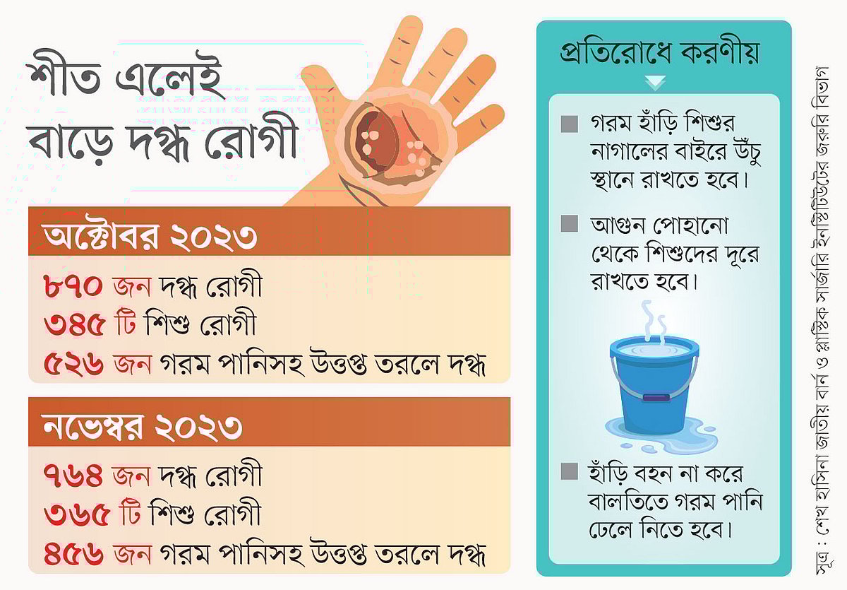 চিকিৎসকেরা বলছেন, শীতকাল আসার সঙ্গে সঙ্গে গরম পানিতে শিশুদের দগ্ধ হওয়ার ঘটনা বাড়ছে। জুন মাসে হাসপাতালের জরুরি বিভাগে গরম পানিসহ গরম চা, দুধ, তরকারি, ডাল, ভাতের মাড় ইত্যাদি উত্তপ্ত তরলে দগ্ধ হয়ে চিকিৎসা নিয়েছেন ২৬২ জন। আর অক্টোবরে ৫২৬ জন ও নভেম্বরে ৪৫৬ জন চিকিৎসা নিয়েছেন। হরতালের কারণে নভেম্বরে রোগী তুলনামূলক কম ছিলেন বলে মনে করছেন চিকিৎসকেরা।