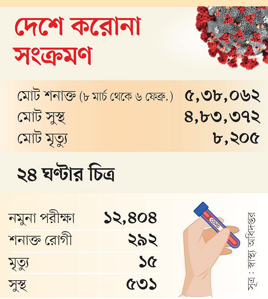 স্বাস্থ্য অধিদপ্তরের তথ্য অনুযায়ী, গতকাল রোববার পর্যন্ত দেশে মোট ৫ লাখ ৩৮ হাজার ৬২ জনের দেহে করোনার সংক্রমণ শনাক্ত হয়েছে। এর মধ্যে মারা গেছেন ৮ হাজার ২০৫ জন। আর সুস্থ হয়েছেন ৪ লাখ ৮৩ হাজার ৩৭২ জন। গত শনিবার সকাল ৮টা থেকে গতকাল সকাল ৮টা পর্যন্ত ২৪ ঘণ্টায় দেশে নতুন রোগী শনাক্ত হয়েছে ২৯২ জন। রোগী শনাক্তের হার ছিল ২ দশমিক ৩৫ শতাংশ। গত ২৪ ঘণ্টায় করোনায় আক্রান্ত ১৫ জনের মৃত্যু হয়েছে।