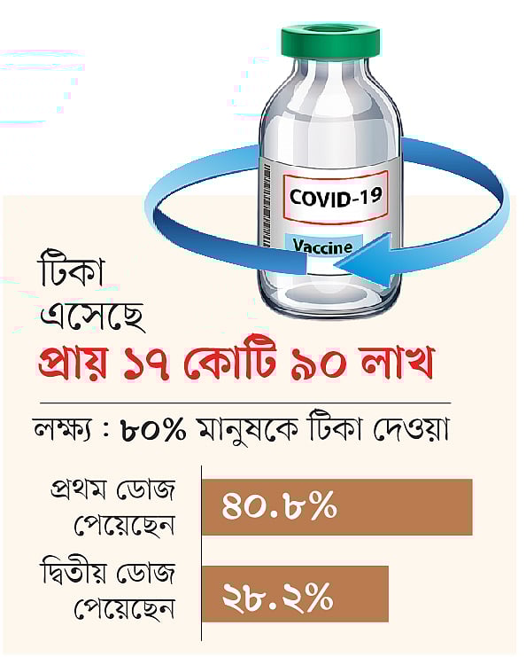 স্বাস্থ্য অধিদপ্তরের টিকা প্রয়োগ পরিকল্পনায় বলা হয়েছিল, দেশের ৮০ শতাংশ মানুষকে টিকা দেওয়া হবে। এর অর্থ সাড়ে ১৩ কোটি মানুষকে টিকার আওতায় আনা। তাঁদের সবাইকে দুই ডোজ করে টিকা দিতে ২৭ কোটি ডোজ দরকার। বছর শেষে দেখা যাচ্ছে, জনসংখ্যার ৪০ দশমিক ৮ শতাংশ প্রথম ডোজ টিকা পেয়েছেন, পূর্ণ দুই ডোজ টিকা পেয়েছেন ২৮ দশমিক ২ শতাংশ। গতকাল রোববারের এই হিসাব বিশ্ব স্বাস্থ্য সংস্থার।