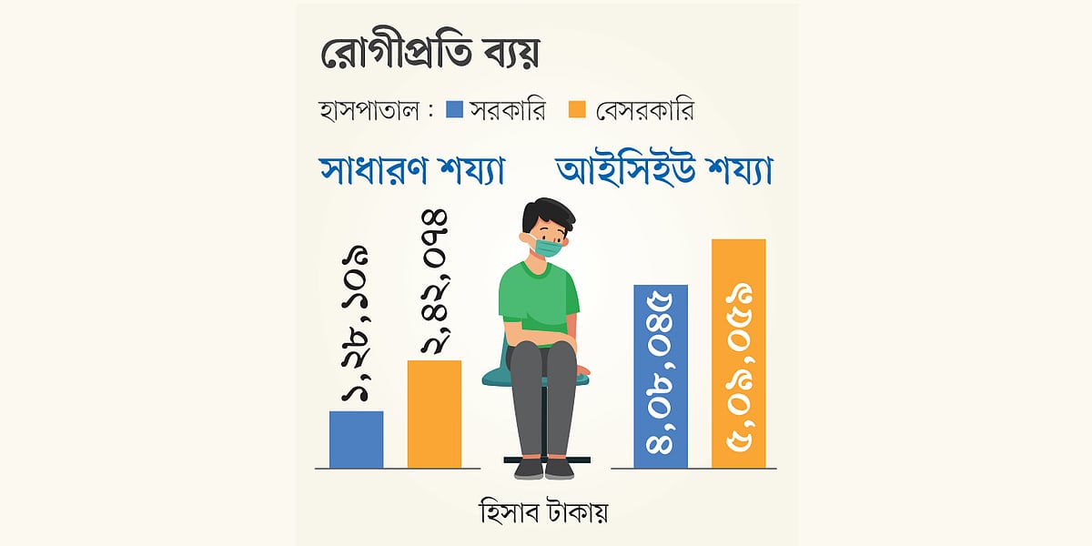 তবে বেসরকারি হাসপাতালে দৈনিক গড় খরচও বেশি। সরকারি হাসপাতালে সাধারণ শয্যা ও আইসিইউতে দৈনিক গড় খরচ যথাক্রমে ১২ হাজার ৮১১ টাকা এবং ৫১ হাজার ৬ টাকা। বেসরকারি হাসপাতালে দুই ধরনের শয্যায় দৈনিক গড় খরচ যথাক্রমে ৩৭ হাজার ১২৮ টাকা এবং ৬৮ হাজার ৮৮৫ টাকা।
