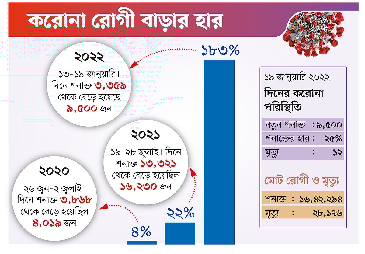 গত ডিসেম্বরের মাঝামাঝি পর্যন্ত দেশে করোনা রোগী শনাক্তের হার ১ শতাংশের ঘরে ছিল। গতকাল তা ছিল ২৫ শতাংশের বেশি