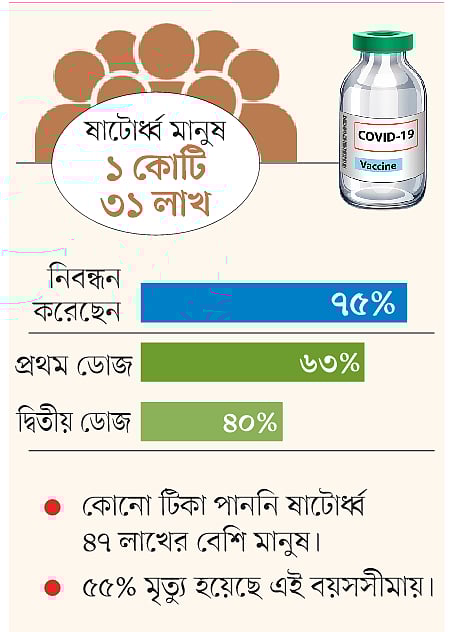 করোনার টিকা পাওয়ার অগ্রাধিকারের তালিকায় প্রথম সারির কর্মীদের পাশাপাশি ছিলেন ষাটোর্ধ্ব বয়সী মানুষ। দেশে এই বয়সী মানুষ আছেন ১ কোটি ৩১ লাখ। স্বাস্থ্য অধিদপ্তরের ১৬ ডিসেম্বরের তথ্য বলছে, তাঁদের মধ্যে ২৫ শতাংশ মানুষ টিকার জন্য নিবন্ধনই করেননি। আর পূর্ণ দুই ডোজ টিকার বাইরে এই বয়সী মানুষ আছেন ৬০ শতাংশের বেশি।