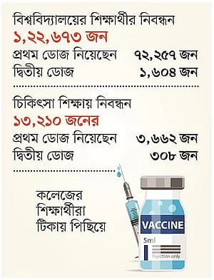 আশিকুল ইসলামের মতো সরকারি বিশ্ববিদ্যালয় এবং মেডিকেল কলেজের শিক্ষার্থীদের অগ্রাধিকার ভিত্তিতে টিকা দেওয়া হচ্ছে। এখন পর্যন্ত বিশ্ববিদ্যালয়ের ৭২ হাজার ২৫৭ জন এবং চিকিৎসাশিক্ষার ৩ হাজার ৬৬২ জন শিক্ষার্থীকে প্রথম ডোজ টিকা দেওয়া হয়েছে। এ ছাড়া প্রায় দুই হাজার শিক্ষার্থী দ্বিতীয় ডোজ টিকা নিয়েছেন। তবে বিশ্ববিদ্যালয়গুলোর মোট শিক্ষার্থীর মধ্যে এখনো অধিকাংশ শিক্ষার্থীই টিকার আওতার বাইরে। এ ছাড়া জাতীয় বিশ্ববিদ্যালয়ের অধিভুক্ত কলেজগুলোর প্রায় ২৯ লাখ শিক্ষার্থী এবং ঢাকা বিশ্ববিদ্যালয়ের অধিভুক্ত সাত কলেজের প্রায় দুই লাখ শিক্ষার্থীর টিকা দেওয়া এখনো শুরু হয়নি। ফলে বিশ্ববিদ্যালয়ে শ্রেণিকক্ষে ক্লাস শুরুর বিষয়টি এখনো অনিশ্চিতই রয়ে গেল।