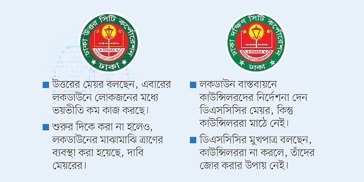 লকডাউনে স্বাস্থ্যবিধির বিষয়ে দুই সিটির পক্ষ থেকে ভ্রাম্যমাণ আদালত পরিচালনা করা হচ্ছে। এর বেশি কোনো তৎপরতা চোখে পড়েনি। অবশ্য ডিএনসিসি কর্তৃপক্ষ জানিয়েছে, ৭ এপ্রিল থেকে করোনাভাইরাস মোকাবিলায় তারা বেশ কিছু কার্যক্রম হাতে নিয়েছে। তবে ডিএনসিসির কাউন্সিলররা জানিয়েছেন, করপোরেশন থেকে এলাকায় বিতরণের জন্য সুরক্ষাসামগ্রী তাঁরা এখনো পাননি।