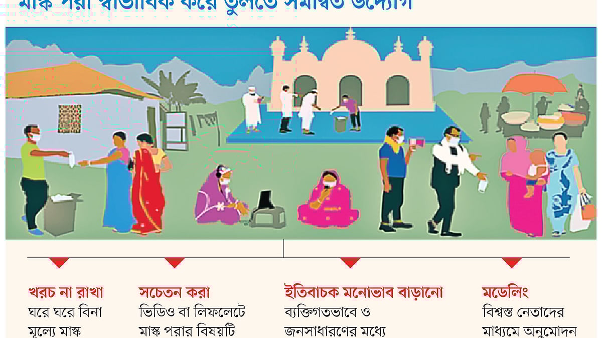 সাধারণ মানুষের মধ্যে মাস্ক পরার অভ্যাস তৈরি করা যে সহজ নয়, তা আমরা সবাই মোটামুটি জেনে গিয়েছি। ব্র্যাক ও যুক্তরাষ্ট্রের ইয়েল বিশ্ববিদ্যালয়ের গবেষকেরা কয়েক মাস ধরে বাংলাদেশের সর্বত্র সাধারণ মানুষের মাস্ক পরার অভ্যাস পর্যবেক্ষণ করেছেন। তাঁরা দেখতে পেয়েছেন, দেশের কোথাও মাস্ক পরার সুষ্ঠু অভ্যাস গড়ে ওঠেনি। এরই ধারাবাহিকতায় যুক্তরাষ্ট্রের ইয়েল, স্ট্যানফোর্ড, এনজিওস ইনোভেশন ফর পভার্টি অ্যাকশন ও গ্রিন ভয়েসের একটি দল বাংলাদেশ সরকারের এটুআই কর্মসূচি এবং বেসরকারি সংস্থা ব্র্যাকের সঙ্গে মিলে দেশের সর্বত্র সব জনগোষ্ঠীর মানুষের মধ্যে মাস্ক পরার অভ্যাস গড়ে তুলতে কী করা যায়, তা বের করার উদ্যোগ নেয়।