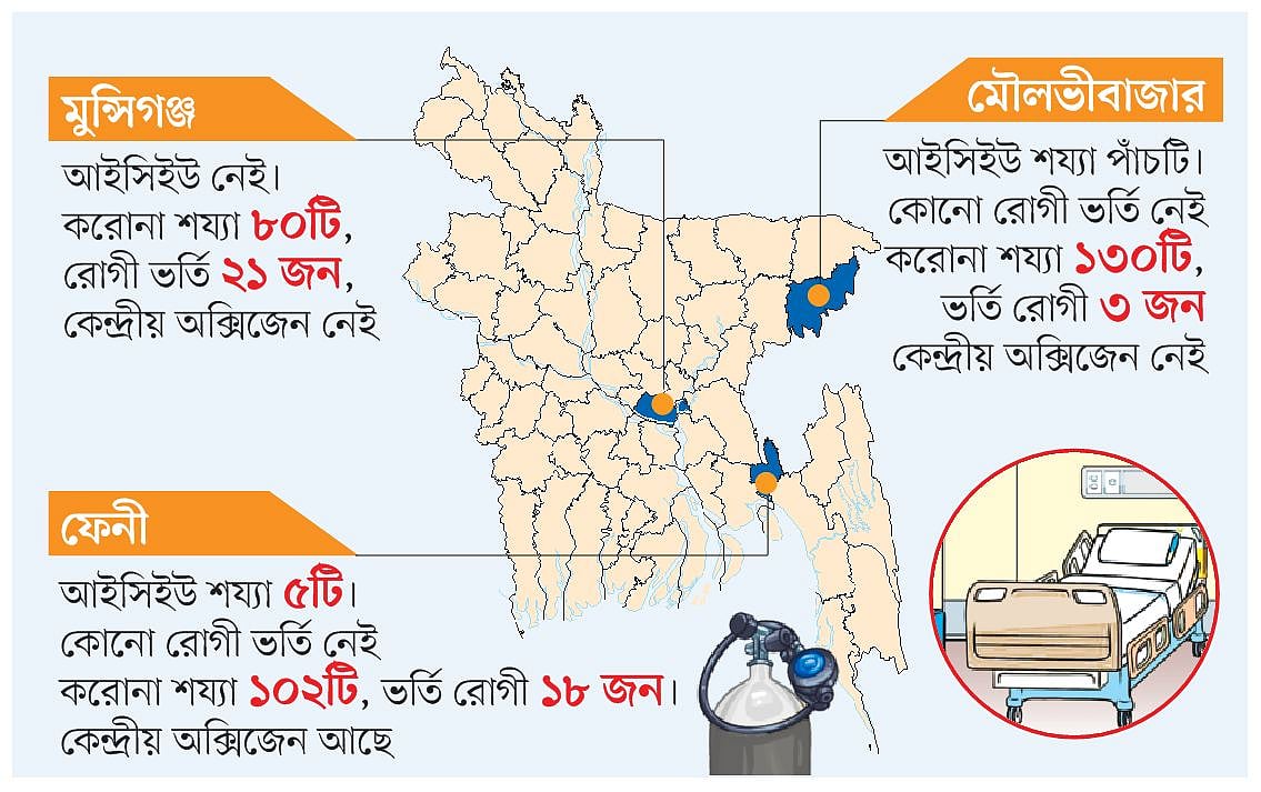 মুন্সিগঞ্জের করোনা শনাক্তের হারও অনেক বেশি। তবে এই জেলায় কোনো আইসিইউ নেই। মুন্সিগঞ্জের জেলা হাসপাতাল ও ৫টি উপজেলা স্বাস্থ্য কমপ্লেক্সে করোনা রোগীদের জন্য মোট ৮০টি শয্যা রয়েছে। গতকাল এসব হাসপাতালে মোট ১৮ জন ভর্তি ছিলেন। জেলার কোনো হাসপাতালেই কেন্দ্রীয় অক্সিজেনের ব্যবস্থা নেই।