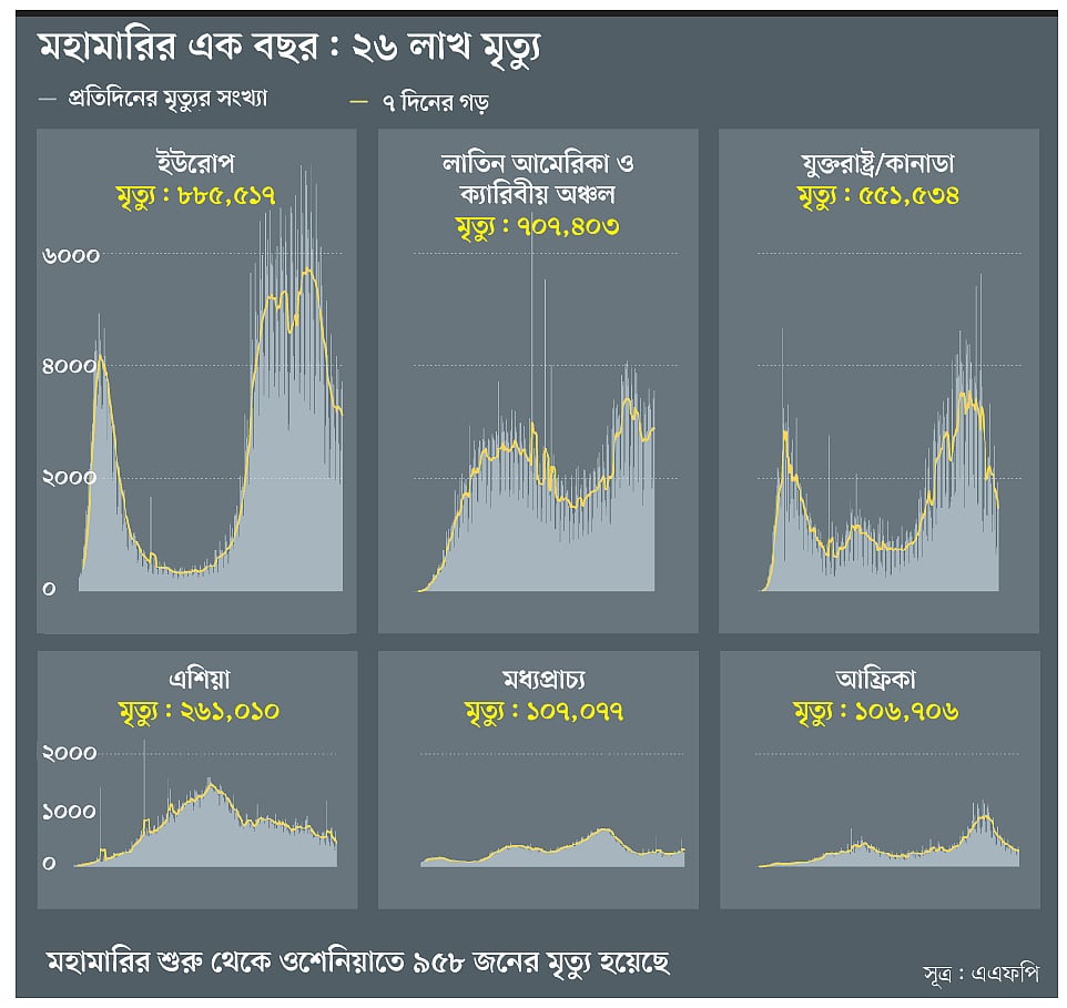 করোনাভাইরাসে আক্রান্ত, মৃত্যু ও সুস্থ হওয়ার পরিসংখ্যানগত তথ্য জানায় বিশ্বখ্যাত জনস হপকিন্স ইউনিভার্সিটি ও ওয়ার্ল্ডোমিটারস। এই দুই ওয়েবসাইটে দেওয়া হিসাব অনুযায়ী, গতকাল শুক্রবার রাত আটটা পর্যন্ত করোনাভাইরাসে বিশ্বব্যাপী আক্রান্তের সংখ্যা ১১ কোটি ৮৫ লাখের বেশি। কোভিড–১৯–এ মৃত্যু ছাড়িয়েছে ২৬ লাখের ঘর। সুস্থ হয়েছে ৯ কোটির বেশি মানুষ।