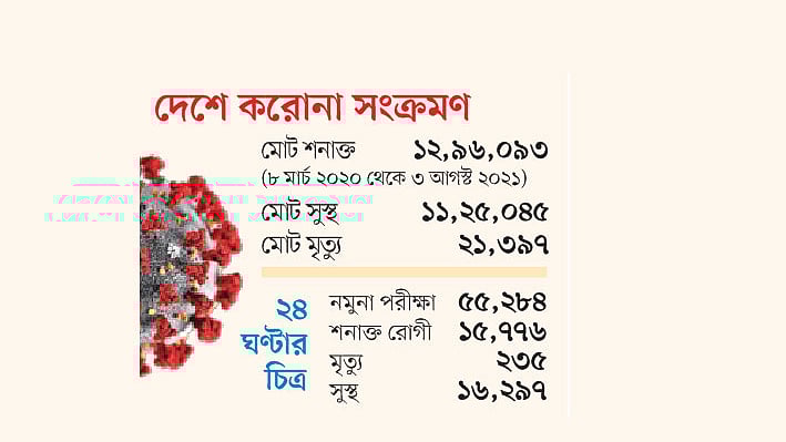 স্বাস্থ্য অধিদপ্তরের তথ্য অনুযায়ী, গত সোমবার সকাল ৮টা থেকে গতকাল মঙ্গলবার সকাল ৮টা পর্যন্ত দেশে করোনায় সংক্রমিত হয়ে আরও ২৩৫ জনের মৃত্যু হয়েছে। এ সময় নতুন রোগী শনাক্ত হয়েছে ১৫ হাজার ৭৭৬ জন। গতকাল পর্যন্ত দেশে শনাক্ত রোগীর সংখ্যা দাঁড়িয়েছে ১২ লাখ ৯৬ হাজার ৯৩। মোট মৃত্যু হয়েছে ২১ হাজার ৩৯৭ জনের। আর করোনায় আক্রান্ত হওয়ার পর এখন পর্যন্ত সুস্থ হয়েছেন ১১ লাখ ২৫ হাজার ৪৫ জন।