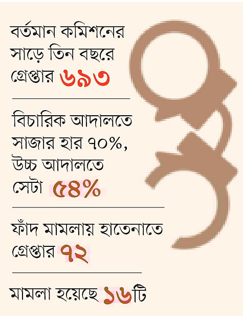 বর্তমান কমিশন দায়িত্ব পালন করছে প্রায় সাড়ে তিন বছর। এই সাড়ে তিন বছরে দুদকের দুর্নীতিবিরোধী কার্যক্রমে গ্রেপ্তার হয়েছেন ৬৯৩ জন। এর বেশির ভাগই সরকারি কর্মকর্তা-কর্মচারী। এ ছাড়া ঘুষ নেওয়ার সময় ফাঁদ পেতে হাতেনাতে গ্রেপ্তার হয়েছেন ৭২ জন।