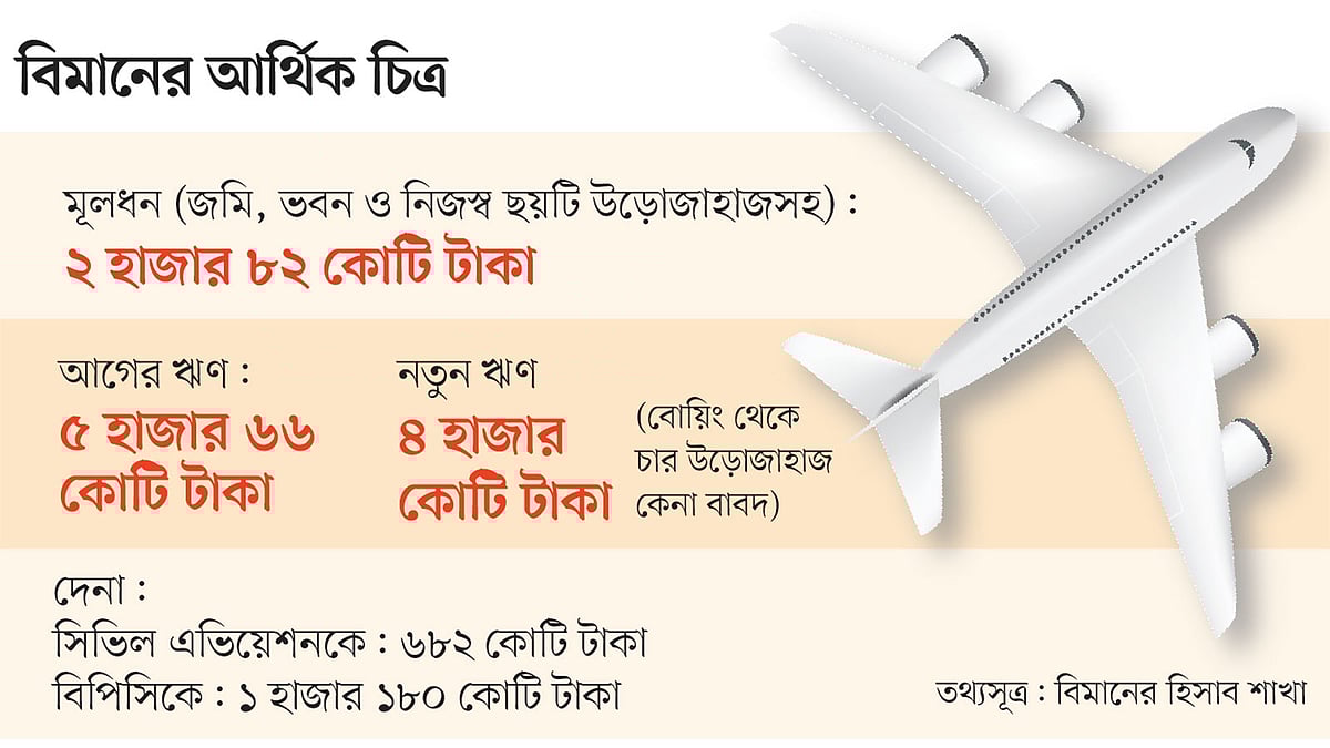 বড় ধরনের আর্থিক ঝুঁকিতে পড়েছে বিমান বাংলাদেশ এয়ারলাইনস। মূলধনের তুলনায় প্রতিষ্ঠানটির ঋণের পরিমাণ এখন আড়াই গুণের বেশি। নতুন চার উড়োজাহাজ কিনতে নেওয়া ঋণ যুক্ত করলে এটা বেড়ে প্রায় পাঁচ গুণে দাঁড়াবে। অঙ্কের হিসাবে ৯ হাজার কোটি টাকা। এর বাইরে সরকারের দুই প্রতিষ্ঠানের কাছে বিমানের দেনা রয়েছে ১ হাজার ৮৬২ কোটি টাকা।