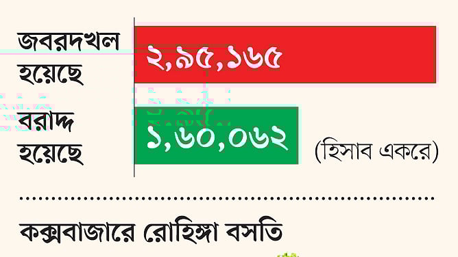 তবে এই হিসাবে অনেক সময় বড় বড় পরিমাণ জমি কয়েকটি করে সংস্থার নামে একত্রে দেখানো আছে। এ ছাড়া মিয়ানমার থেকে আসা রোহিঙ্গাদের বসতির কারণে কক্সবাজারের উখিয়া ও টেকনাফে ছয় হাজার একরের কিছু বেশি বনভূমি ধ্বংস হয়ে গেছে। এটা আনুষ্ঠানিক বরাদ্দের বাইরে।