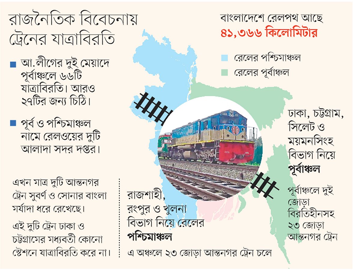 বর্তমান সরকারের আমলে রাজনৈতিক বিবেচনায় আন্তনগর ট্রেন তূর্ণা, প্রভাতী, গোধূলী, জয়ন্তিকা, উপকূল, পাহাড়িকা, উদয়ন, পারাবতসহ বিভিন্ন ট্রেনের যাত্রাবিরতি বাড়ানো হয়েছে। সংশ্লিষ্ট কর্মকর্তাদের ভাষ্য, ট্রেনের যাত্রাবিরতি বাড়ানো হলে জ্বালানি খরচ বাড়ে। সেই তুলনায় টিকিট বিক্রি না হলে লোকসান গুনতে হয়।