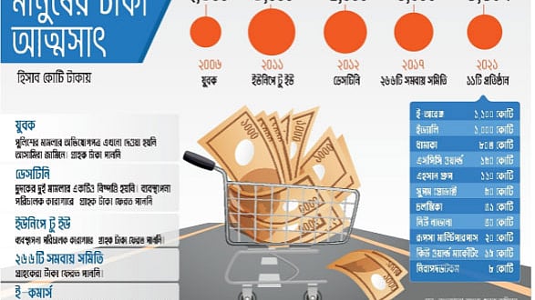 সেই যুবক, এখনকার ই-কমার্স এবং বহুস্তর বিপণন (এমএলএম) কোম্পানি ও সমবায় সমিতি—সব মিলিয়ে গত ১৫ বছরে ২৮০টি প্রতিষ্ঠান মানুষের অন্তত ২১ হাজার ১৭ কোটি টাকা লোপাট করেছে বলে বেরিয়ে এসেছে। সব ক্ষেত্রেই উপায় ছিল গ্রাহককে বেশি মুনাফা ও ছাড়ের লোভ দেখানো। টাকার এই হিসাব বাংলাদেশ ব্যাংক, যুবকের ঘটনায় গঠন করা কমিশন, আইনশৃঙ্খলা রক্ষাকারী বাহিনীর তদন্ত ও গ্রাহকদের দাবির ভিত্তিতে তৈরি। এর মধ্যে রয়েছে ২০০৬ সালে যুবকের ২ হাজার ৬০০ কোটি, ২০১১ সালে ইউনিপে টু ইউর ৬ হাজার কোটি, ২০১২ সালে ডেসটিনির ৫ হাজার কোটি এবং ২০০৮ থেকে ২০১৭ সাল সময়ে ২৬৬টি সমবায় সমিতির গ্রাহকদের ৪ হাজার ১০০ কোটি টাকা লোপাটের ঘটনা।