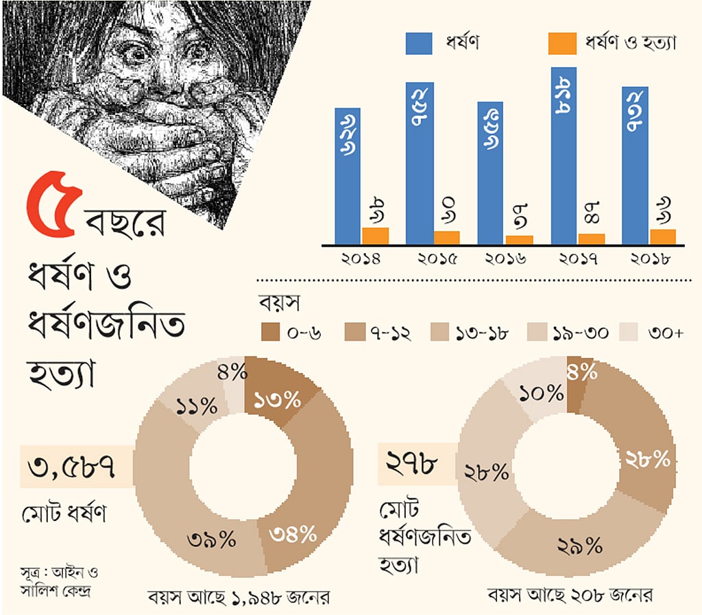 আসকের হিসাব বলছে, গত পাঁচ বছরে ধর্ষণজনিত হত্যার শিকার হয়েছে ২৭৮ জন। ধর্ষণের শিকার হয়ে আত্মহত্যা করেছে ৪২ জন। বেশির ভাগেরই বয়সের তথ্য আছে। তা থেকে দেখা যায়, আত্মহত্যাকারীদের ৮৬ শতাংশের বয়স ১৮ বছরের মধ্যে।