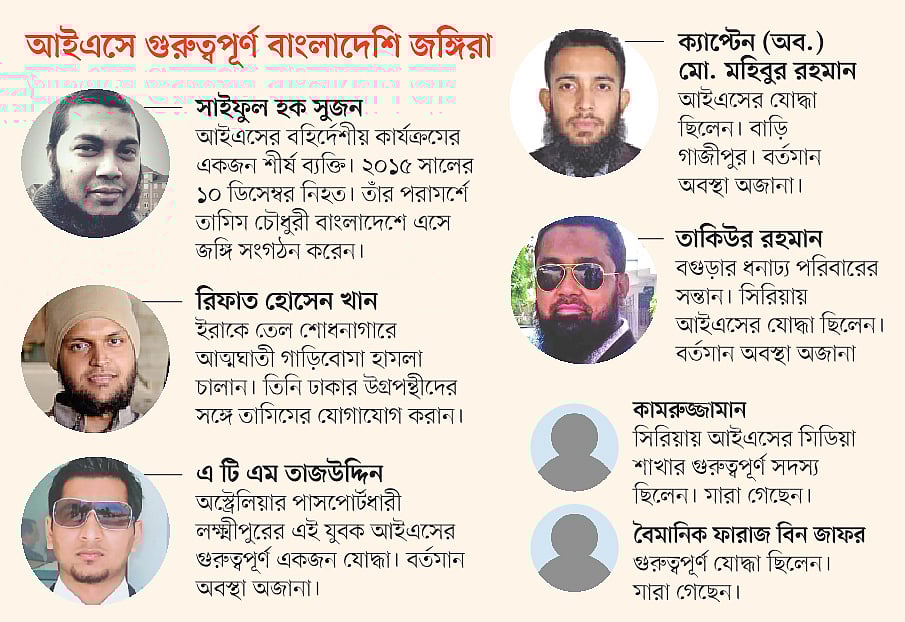 অস্ট্রেলিয়ার পাসপোর্টধারী এ টি এম তাজউদ্দিনও গুরুত্বপূর্ণ যোদ্ধা বলে বাংলাদেশের গোয়েন্দাদের কাছে তথ্য রয়েছে। তিনি আইএসের শুরুর দিকে সিরিয়া যান। তাঁর গ্রামের বাড়ি লক্ষ্মীপুর। বগুড়ার এ কে এম তাকিউর রহমানও যোদ্ধা বলে জানা গেছে। বৈমানিক ফারাজ বিন জাফর ও ক্যাপ্টেন (অব.) মো. মহিবুর রহমান গুরুত্বপূর্ণ জঙ্গি ছিলেন। ফারাজ বিন জাফর মারা গেছেন। বাকিদের অবস্থা সম্পর্কে নিশ্চিত কোনো তথ্য জানা যায়নি। নাম প্রকাশ না করার শর্তে বাংলাদেশের একজন কর্মকর্তা বলেন, বাংলাদেশিদের বড় অংশ সিরিয়ায় যোদ্ধা ছিলেন না। যাঁর যাঁর দক্ষতা অনুযায়ী বিভিন্ন কাজে যুক্ত ছিলেন।