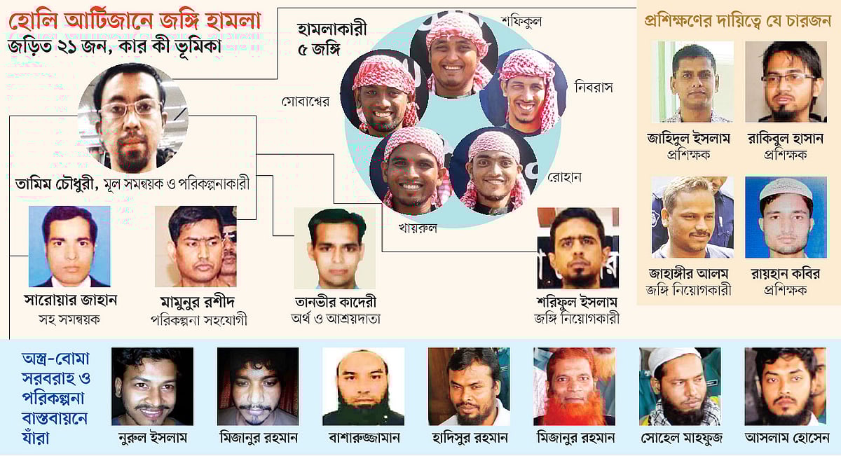 জঙ্গিরা হত্যা করেছিলেন ২০ জন দেশি-বিদেশি নাগরিককে; যাঁদের মধ্যে ৯ জন ইতালীয়, ৭ জন জাপানি, ১ জন ভারতীয় ও ৩ জন বাংলাদেশি।
