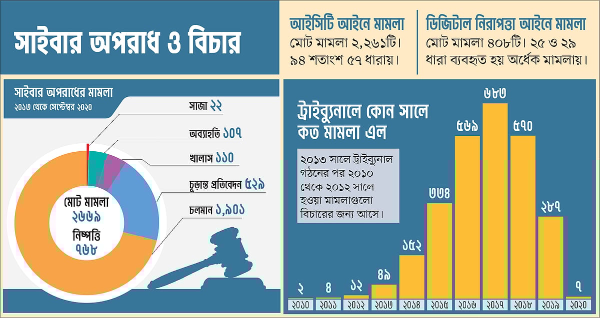 সাইবার অপরাধের বিচারের জন্য ২০০৬ সালে বিএনপি–জামায়াত সরকার আইসিটি আইন করে। ২০১৩ সালে আওয়ামী লীগ সরকার বিচারের জন্য সাইবার ট্রাইব্যুনাল গঠন করে। গত বছরের সেপ্টেম্বর পর্যন্ত ট্রাইব্যুনালে ২ হাজার ৬৬৯টি মামলা আসে। প্রথম আলো দুই বছর ধরে মামলাগুলোর তথ্য সংগ্রহ করেছে। তার ভিত্তিতে করা তিন পর্বের ধারাবাহিকের প্রথম পর্ব ছাপা হলো আজ।