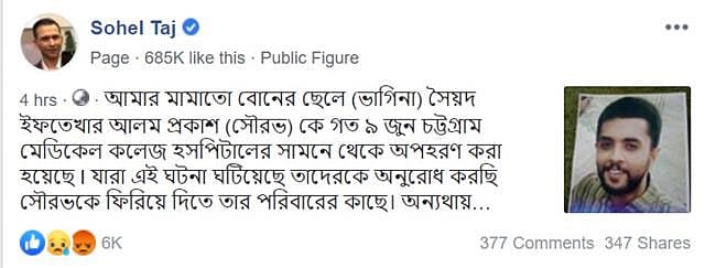 সোহেল তাজের ভাগ্নে সৌরভ গত ৯ জুন চট্টগ্রাম থেকে অপহৃত হন। ঢাকা রিপোর্টার্স ইউনিটিতে গতকাল মঙ্গলবার আয়োজিত সংবাদ সম্মেলনে সৌরভের বাবা-মা জানান, গত ১৬ মে বনানীর একটি বাসা থেকে র্যাব-১ পরিচয়ে সৌরভকে একদল লোক তুলে নিয়ে যায়। তারাই দ্বিতীয় দফা অপহরণের সঙ্গে জড়িত। অপহরণের প্রথম থেকে র্যাব-পুলিশ ছাড়াও তাঁরা দুটি গোয়েন্দা সংস্থার যুক্ততার কথা বলছেন। তাঁদের অভিযোগ সৌরভের ব্যক্তিগত একটি সম্পর্কের জের ধরে তাঁকে তুলে নিয়ে যাওয়া হয়।