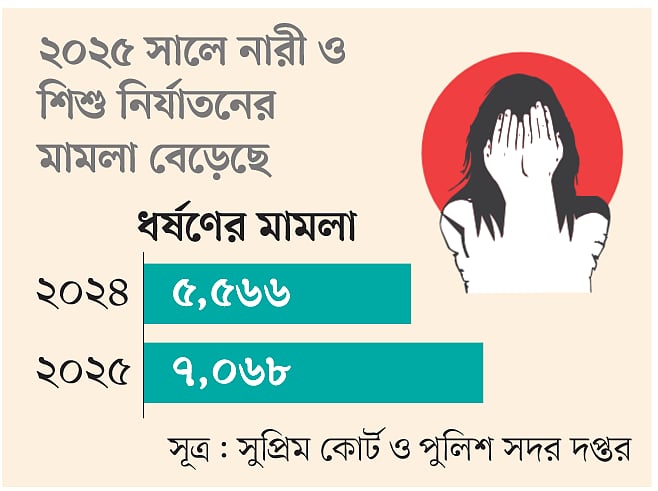 ২০২৫ সালে হওয়া মামলার মধ্যে ৭ হাজার ৬৮টি মামলা ধর্ষণের অভিযোগের। ভুক্তভোগীদের মধ্যে প্রাপ্তবয়স্ক নারী ৫ হাজার ১৭১ জন ও শিশু ১ হাজার ৮৯৭টি। ২০২৪ সালের তুলনায় গত বছর নারী নির্যাতনের মামলার সংখ্যা ২৫ শতাংশ বেড়েছে। ২০২৪ সালে ১৭ হাজার ৫৭১টি মামলা হয়। এর মধ্যে ধর্ষণের মামলা ছিল ৫ হাজার ৫৬৬টি। তার আগে ২০২৩ সালে ১৮ হাজার ৯৪১টি, ২০২২ সালে ২১ হাজার ৭৬৬টি ও ২০২১ সালে ২২ হাজার ১৩৬টি মামলা হয়েছিল নারী নির্যাতনের অভিযোগে।