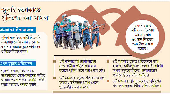 অবশ্য ৩৫ মামলায় উঠে আসা ৬২ জন হত্যায় কারা জড়িত, তা পুলিশ বের করতে পারেনি। খুনিদের শনাক্ত করতে না পেরে সম্প্রতি সেই সব মামলায় আদালতে চূড়ান্ত প্রতিবেদন জমা দেওয়া হয়েছে। আইনজীবী ও সংশ্লিষ্ট ব্যক্তিদের মতে, আওয়ামী লীগ সরকার জুলাই হত্যাকাণ্ডে নিজেদের দায় এড়াতে বিএনপি ও জামায়াতের ওপর দোষ চাপিয়ে পুলিশকে দিয়ে মামলা করিয়েছিল। সেসব মামলা থেকে বিএনপি ও জামায়াতের নেতা-কর্মীদের অব্যাহতি দেওয়া গ্রহণযোগ্য। কিন্তু হত্যাকাণ্ডে কারা জড়িত, তা শনাক্ত করতে না পারা গ্রহণযোগ্য নয়।