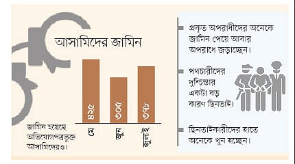 ছিনতাইকালে হাতেনাতে ধরা হলে অথবা পুরোনো আরও মামলা থাকলে সাধারণত সেসব আসামির জামিন হয় না। তবে সন্দেহভাজন হিসেবে যাঁরা গ্রেপ্তার হন, তাঁদের তো বছরের পর বছর আটকে রাখা যায় না। বেশির ভাগ ক্ষেত্রে পাঁচ-ছয় মাস পর তাঁদের জামিন হয়।ঢাকা মহানগর দায়রা জজ আদালতের প্রধান পাবলিক প্রসিকিউটর (পিপি) ওমর ফারুক ফারুকী
