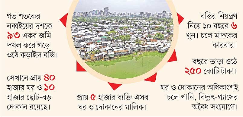 গত শতকের নব্বইয়ের দশকে তিনটি সরকারি সংস্থার ৯৩ একর জমি দখল করে গড়ে তোলা হয় কড়াইল বস্তি। সেখানে প্রায় ৪০ হাজার ঘর রয়েছে। বস্তি ঘিরে আরও রয়েছে ১০ হাজার ছোট–বড় দোকান। প্রায় পাঁচ হাজার ব্যক্তি এসব ঘর ও দোকানের মালিক। এসব ঘর ও দোকানের অধিকাংশই চলে অবৈধ পানি ও বিদ্যুৎ–গ্যাসের সংযোগে।