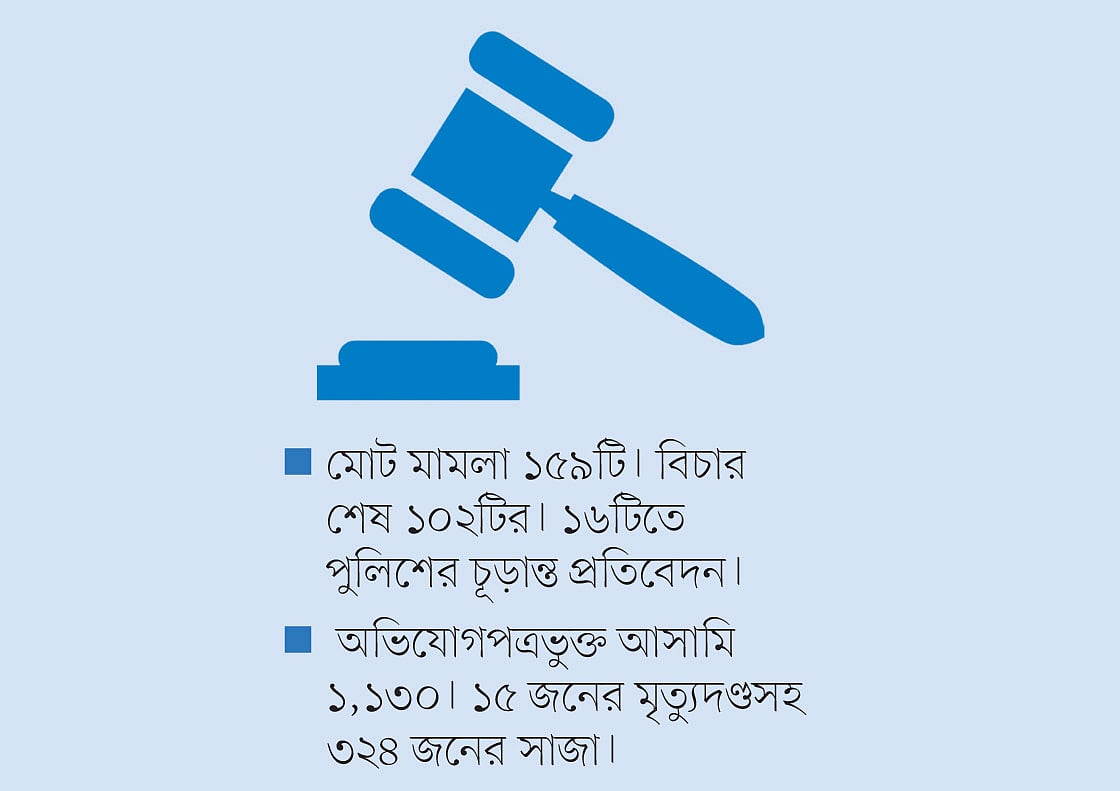 মামলাগুলোর রায়ে ৩৫৮ জন খালাস পান। আসামিদের পূর্ণাঙ্গ নাম-ঠিকানা না পাওয়ায় পুলিশ ১৬টি মামলায় চূড়ান্ত প্রতিবেদন দিয়েছে। এখনো ৪১টি মামলার রায় হয়নি। এর মধ্যে ঢাকার আদালতে পাঁচটি মামলা বিচারাধীন রয়েছে।