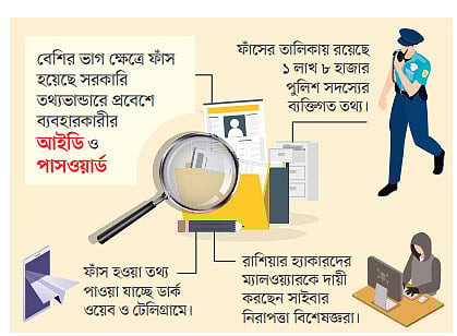 সরকারি বিভিন্ন সংস্থার সংবেদনশীল নানা তথ্য ইন্টারনেট জগতে ফাঁস হয়েছে। এর মধ্যে রয়েছে পুলিশের এক লাখের বেশি সদস্যের ব্যক্তিগত তথ্য। আরও রয়েছে পুলিশের একটি তথ্যভান্ডারে প্রবেশের আইডি (পরিচয়) ও গোপন নম্বর (পাসওয়ার্ড)।