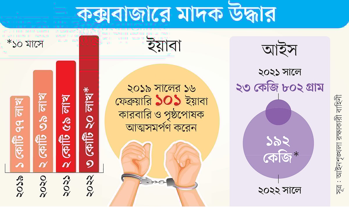 ওই বছর আইনশৃঙ্খলা রক্ষাকারী বাহিনীর অভিযানে ১ কোটি ৭৭ লাখ ইয়াবা উদ্ধার করা হয়। পরের বছর সেই সংখ্যা দাঁড়ায় ২ কোটি ৩৯ লাখে। গত বছর ২ কোটি ৫৯ লাখ ৬৭ হাজার ৯৫০ ইয়াবার পাশাপাশি ২৩ কেজি ৮০২ গ্রাম ক্রিস্টাল মেথ (আইস) উদ্ধার করা হয়। আর চলতি বছরের ১০ মাসে উদ্ধার করা হয়েছে ৩ কোটি ২০ লাখ ইয়াবা ও ১৯২ কেজির বেশি আইস। ১৮ নভেম্বর উখিয়ার পালংখালীর রহমতের বিল গ্রামে অভিযান চালিয়ে ৫০ হাজার ইয়াবা বড়ি উদ্ধার করে বিজিবি।