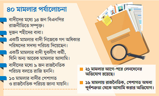 যে ৪০টি মামলার খোঁজখবর নিয়েছে প্রথম আলো, সেগুলোর মধ্যে ২৩টি ঢাকা মহানগরের বিভিন্ন থানায় ও ৯টি চট্টগ্রামে করা মামলা। বাকি ৮টি মামলার মধ্যে ৬টি নারায়ণগঞ্জের, কিশোরগঞ্জ ও ফেনীর ২টি মামলা। এসব মামলার বাদীদের মধ্যে ১৪ জন বিএনপির রাজনীতির সঙ্গে জড়িত। দুজন শহীদের বাবা। একটি মামলার বাদী নিজেকে গণ অধিকার পরিষদের সদস্য হিসেবে পরিচয় দিয়েছেন। একটি মামলার বাদী যুবলীগ কর্মী, যিনি অন্য মামলার আসামি। বাকি ২২টি মামলার বাদীদের মধ্যে ৯ জন তাঁদের রাজনৈতিক পরিচয় জানাতে চাননি। ১৩ মামলার বাদীর রাজনৈতিক বা পেশাগত পরিচয় জানা যায়নি।