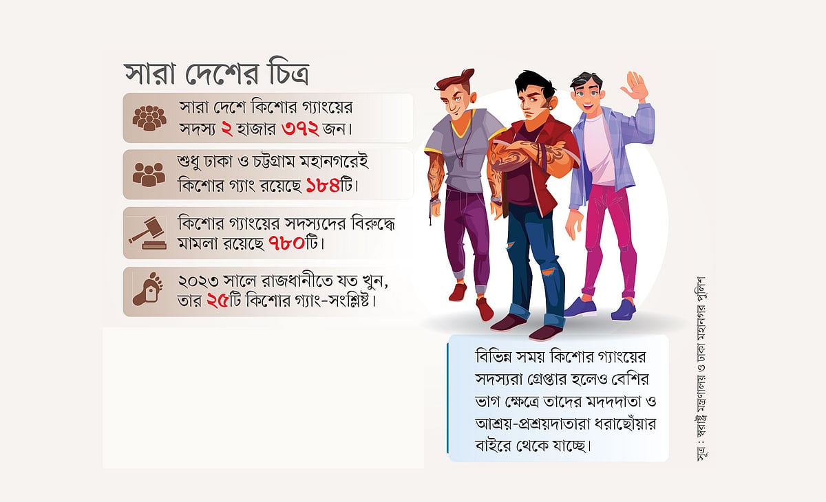ছিনতাই, চাঁদাবাজি, মাদক ব্যবসা, জমি দখল, নারীদের উত্ত্যক্ত করা—দেশের যেকোনো এলাকায় এখন এ ধরনের অপরাধ ঘটলে ‘কিশোর গ্যাং’-এর নাম আসছে। অথচ এক যুগ আগেও পাড়া-মহল্লাকেন্দ্রিক অপরাধের ঘটনায় নাম আসত কোনো না কোনো সন্ত্রাসী বাহিনীর। এখন সে জায়গা ‘দখল’ করেছে কথিত কিশোর গ্যাং। যদিও এসব বাহিনীর সদস্যদের বেশির ভাগই ১৮ বছরের বেশি বয়সী।