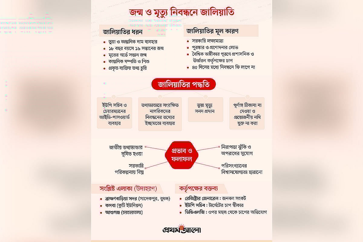 মানুষের জন্ম-মৃত্যুর তথ্য নিবন্ধনের দায়িত্বে থাকা ইউনিয়ন পরিষদগুলোতে ইচ্ছেমতো শিশুদের জন্মের তথ্য দেখানো হচ্ছে। তারপর অল্প কয়েক দিনের মধ্যে তাদের মৃত্যুর তথ্য দেখা হচ্ছে। কারণ, ইউনিয়ন পরিষদগুলোতে জন্ম-মৃত্যুনিবন্ধনের লক্ষ্যপূরণের চাপ থাকে। পাশাপাশি লক্ষ্য পূরণ করলে পাওয়া যায় স্বীকৃতি। এ কারণে জালিয়াতির আশ্রয় নেওয়া হচ্ছে।