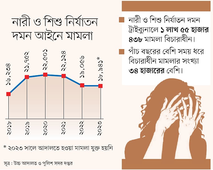 উচ্চ আদালত সূত্রে পাওয়া গত ৩১ ডিসেম্বর পর্যন্ত তথ্য অনুসারে, সারা দেশের ৯৯টি নারী ও শিশু নির্যাতন দমন ট্রাইব্যুনালে ১ লাখ ৫৫ হাজার ৪৩৮টি মামলা বিচারাধীন। পাঁচ বছরের বেশি সময় ধরে বিচারাধীন মামলার সংখ্যা ৩৪ হাজারের বেশি।