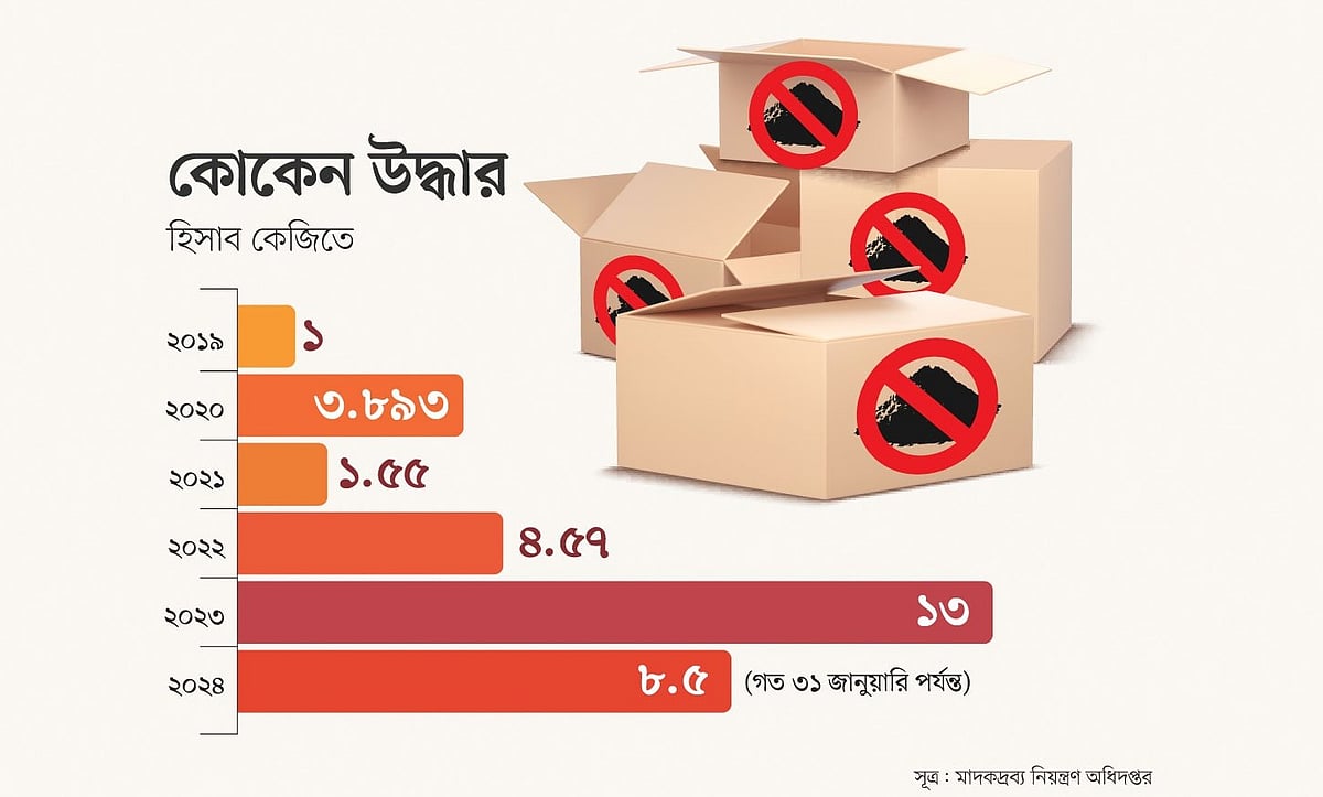 ২০১৪ থেকে ২০২৪ সাল পর্যন্ত ১০ বছরে দেশে প্রায় ৪১ কেজি কোকেন ধরা পড়েছে। এর মধ্যে সবচেয়ে বেশি ১৩ কেজি কোকেন ধরা পড়েছে গত বছর। আর গত ২৬ জানুয়ারি এক চালানেই ধরা পড়েছে সাড়ে ৮ কেজি। এ ঘটনায় মালাবি, ক্যামেরুন, নাইজেরিয়া ও বাংলাদেশের আটজনকে গ্রেপ্তার করা হয়েছে। চক্রের প্রধান নাইজেরিয়ার নাগরিক। তিনি এখনো ধরা পড়েননি।