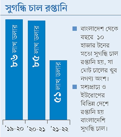 কৃষি সম্প্রসারণ অধিদপ্তরের (ডিএই) হিসাবে, দেশে বছরে সাড়ে তিন কোটি টনের বেশি চাল উৎপাদিত হয়। এর মধ্যে মাত্র ৩ থেকে ৪ শতাংশ সুগন্ধি চাল। সাধারণত কৃষকেরা অন্য ধানের পাশাপাশি কিছু জমিতে সুগন্ধি জাতের ধান আবাদ করেন।