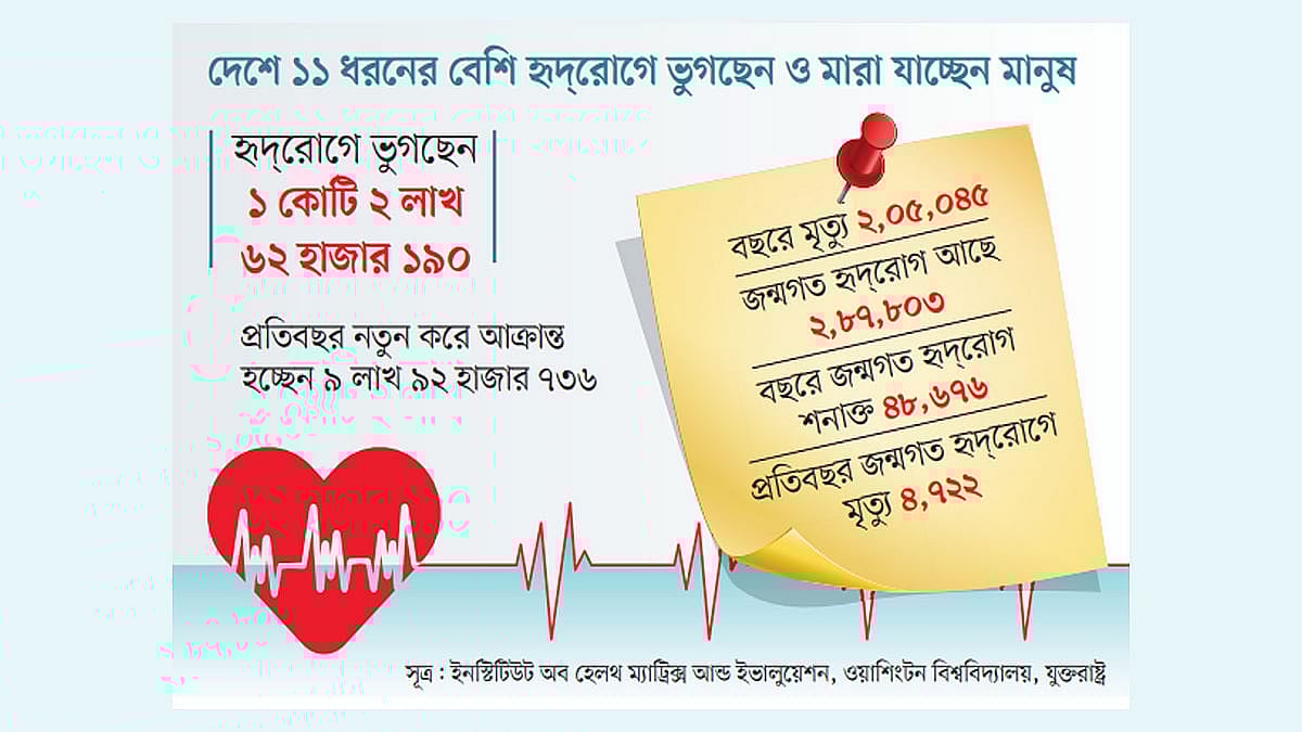 দেশে মৃত্যুর অন্যতম প্রধান কারণ হৃদ্রোগ। প্রতিদিন ৫৬২ জন মানুষ মারা যান হৃদ্রোগে। বিশেষজ্ঞরা বলছেন, হৃদ্রোগের ঝুঁকি দিন দিন বাড়ছে। দেশে প্রতিবছর কত মানুষ হৃদ্রোগে আক্রান্ত হন, হৃদ্রোগে ভোগা মানুষের সংখ্যা কত, কত শিশু হৃৎপিণ্ডের ত্রুটি নিয়ে জন্মাচ্ছে, প্রতিবছর কত মানুষ হৃদ্রোগে মারা যাচ্ছেন, তার সঠিক পরিসংখ্যান নেই। কিছু নির্ভরযোগ্য পরিসংখ্যান পাওয়া যায় যুক্তরাষ্ট্রভিত্তিক একটি আন্তর্জাতিক উদ্যোগ থেকে।