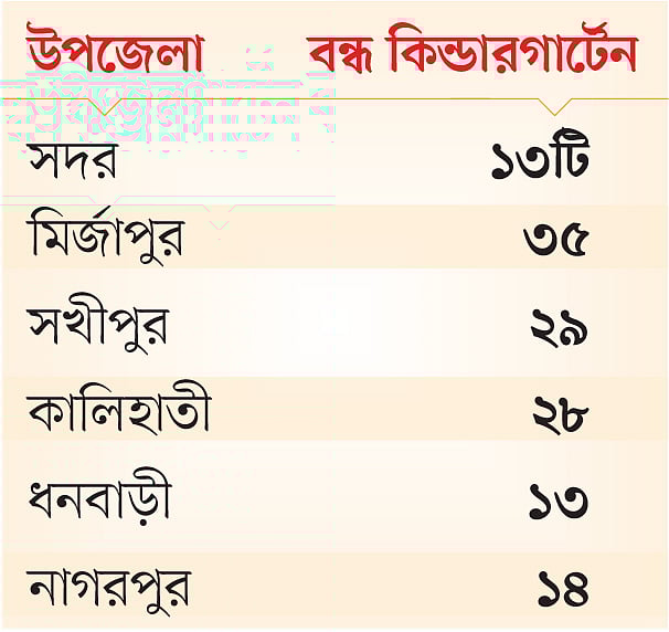 সমন্বয় কমিটি সূত্র জানায়, জেলার মধ্যে সবচেয়ে বেশি কিন্ডারগার্টেন বন্ধ হয়েছে মির্জাপুরে। এ উপজেলায় ১১০টির মধ্যে ৩৫টি কিন্ডারগার্টেন বন্ধ হয়ে গেছে। এ ছাড়া সখীপুরে ১১০টির মধ্যে ২৯টি, কালিহাতীতে ৮১টির মধ্যে ২৮টি, ঘাটাইলে ৯৪টির মধ্যে ২৪টি কিন্ডারগার্টেন এখন বন্ধ। সবচেয়ে কম কিন্ডারগার্টেন বন্ধ হয়েছে গোপালপুরে, ৩০টির মধ্যে ৪টি।