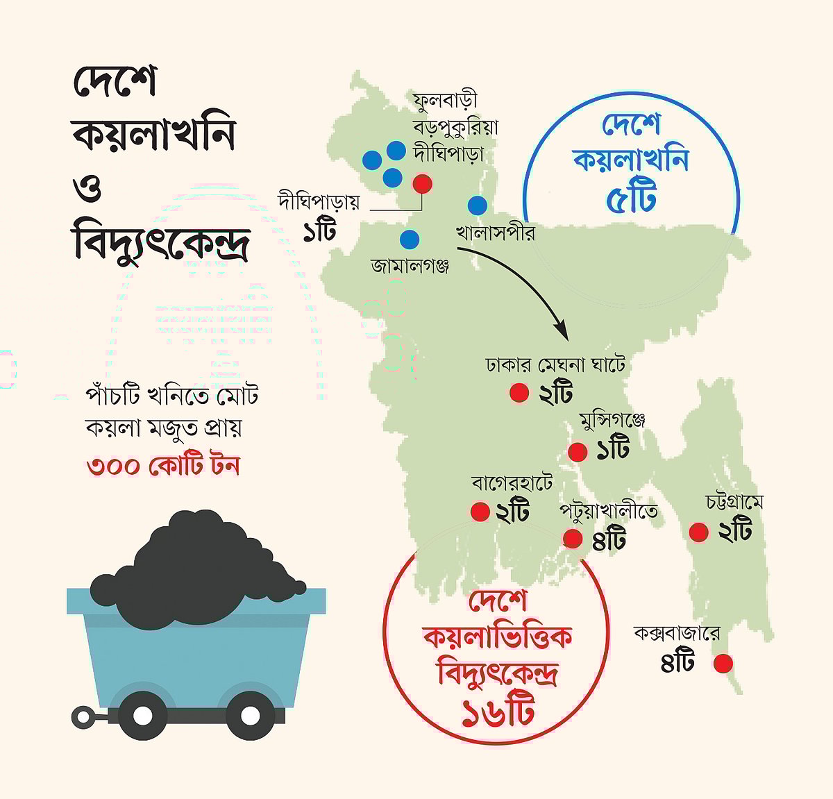 বাংলাদেশ ভূতাত্ত্বিক জরিপ অধিদপ্তরের প্রাথমিক হিসাব অনুযায়ী দেশের পাঁচটি কয়লাখনিতে মোট কয়লার মজুত প্রায় ৩০০ কোটি টন। এর মধ্যে তিনটি খনির সম্ভাব্যতা যাচাই শেষ হয়েছে, যার একটি দিনাজপুরের বড়পুকুরিয়া থেকে কয়লা উত্তোলনও হচ্ছে। বাকি দুটির মধ্যে একটি দিনাজপুরের দীঘিপাড়া, অন্যটি ফুলবাড়ী। এসব খনিমুখে বিদ্যুৎকেন্দ্র করা গেলে বিদ্যুতের উৎপাদন খরচ অনেক কম হয়।
