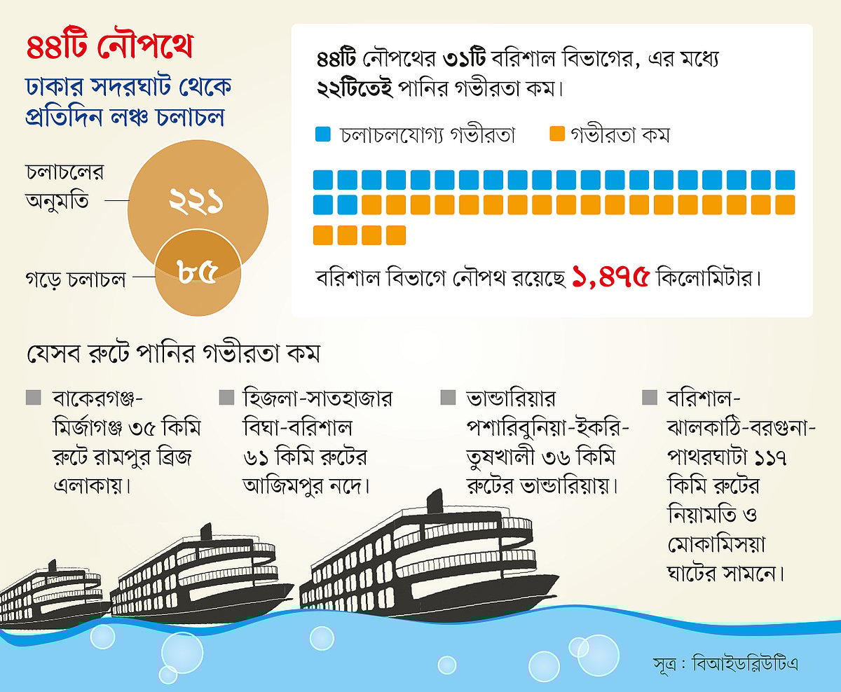 বাংলাদেশ অভ্যন্তরীণ নৌপরিবহন কর্তৃপক্ষ (বিআইডব্লিউটিএ) সূত্র জানায়, ঢাকার সদরঘাট থেকে ৪৪টি নৌপথে প্রতিদিন ২২১টির মতো লঞ্চ চলাচলের অনুমতি থাকলেও প্রতিদিন গড়ে চলাচল করে ৮৫টি। এসব নৌপথের ৩১টিই বরিশাল বিভাগের; এর মধ্যে ২২টিতেই পানির গভীরতা কমে গেছে। এই বিভাগে নৌপথ রয়েছে ১ হাজার ৪৭৫ কিলোমিটার।
