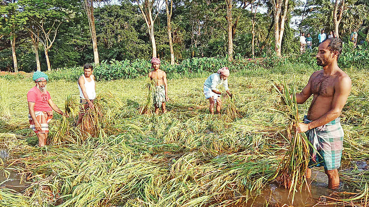 কৃষক দেলোয়ার খান (৫০) প্রতিবছরই আগাম আমন ও তরমুজের চাষ করেন। এ বছর তিনি ৯ একর জমিতে আমনের আবাদ করেছেন। ঘূর্ণিঝড় বুলবুলের আঘাতে তাঁর আমন খেত ক্ষতিগ্রস্ত হয়েছে। খেতের অনেক স্থানের ধানগাছ মাটিতে পড়ে গেছে। খেতে পানি কমতে শুরু করেছে। তবে গাছে পচন ধরায় বাধ্য হয়ে তাঁকে আধা পাকা ধান কেটে নিতে হচ্ছে।